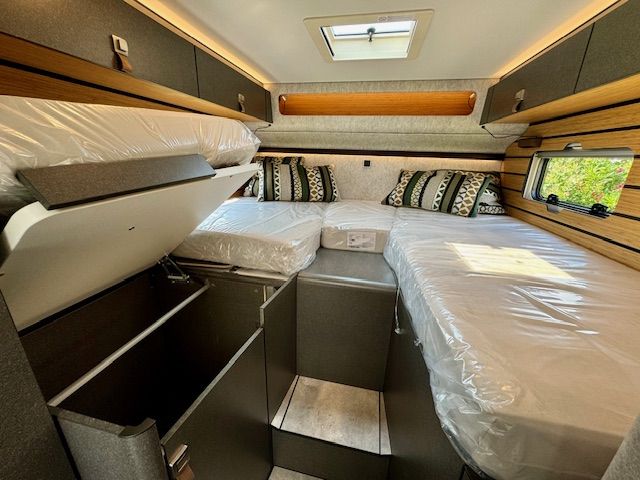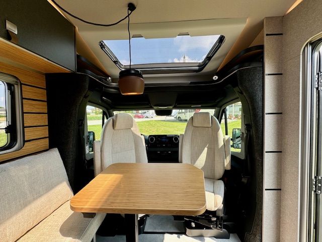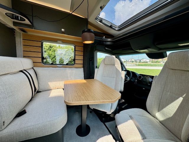 • Dinette a L confortevole con cuscini Lounge, tavolo traslabile nei due sensi e 2 cinture di sicurezza integrate a 3 punti