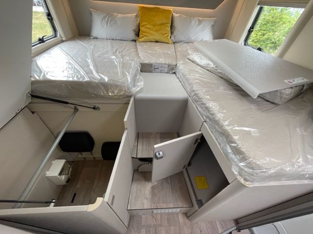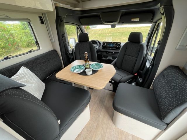 • Dinette a L confortevole con cuscini Lounge, tavolo traslabile nei due sensi e 2 cinture di sicurezza